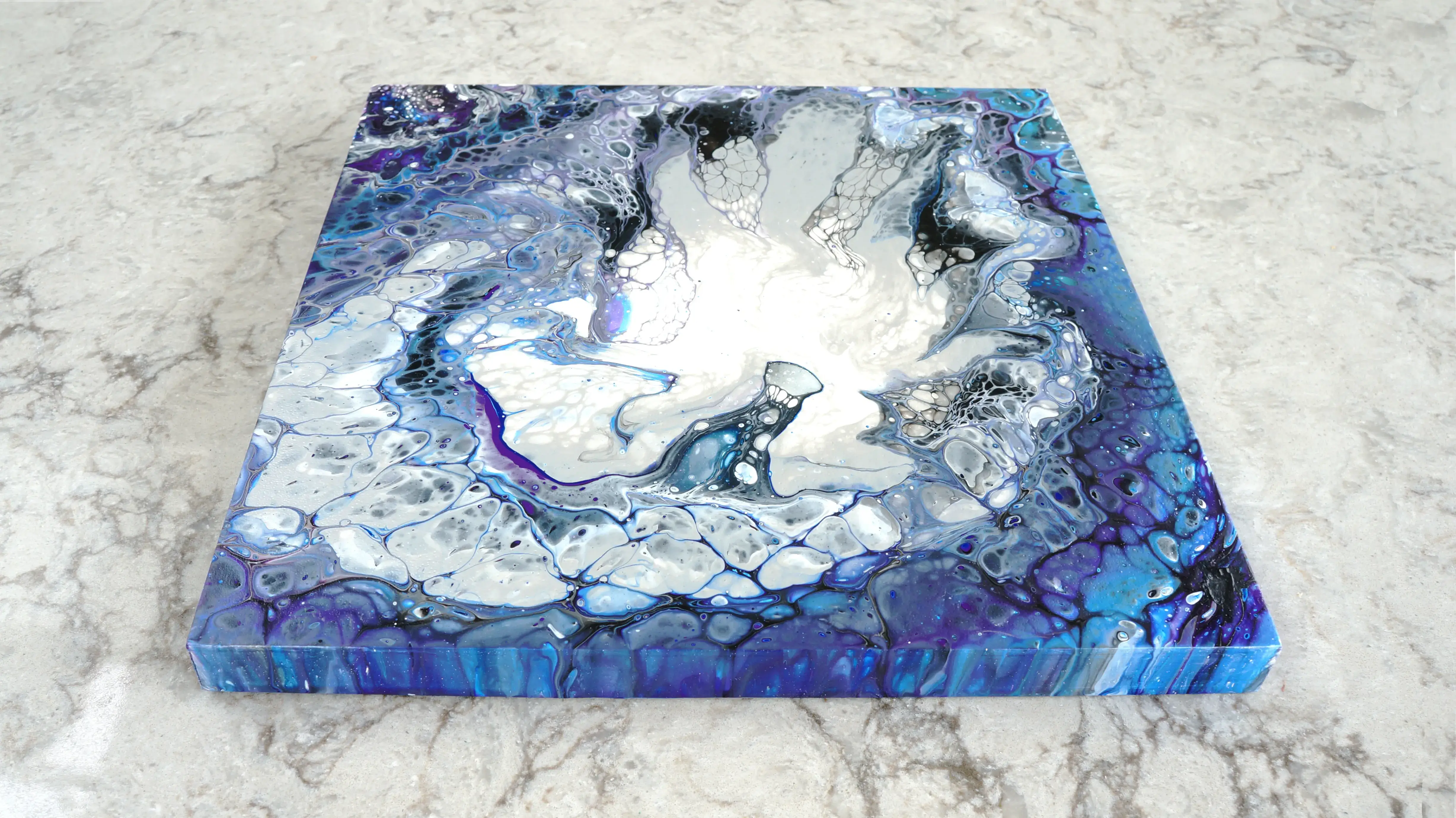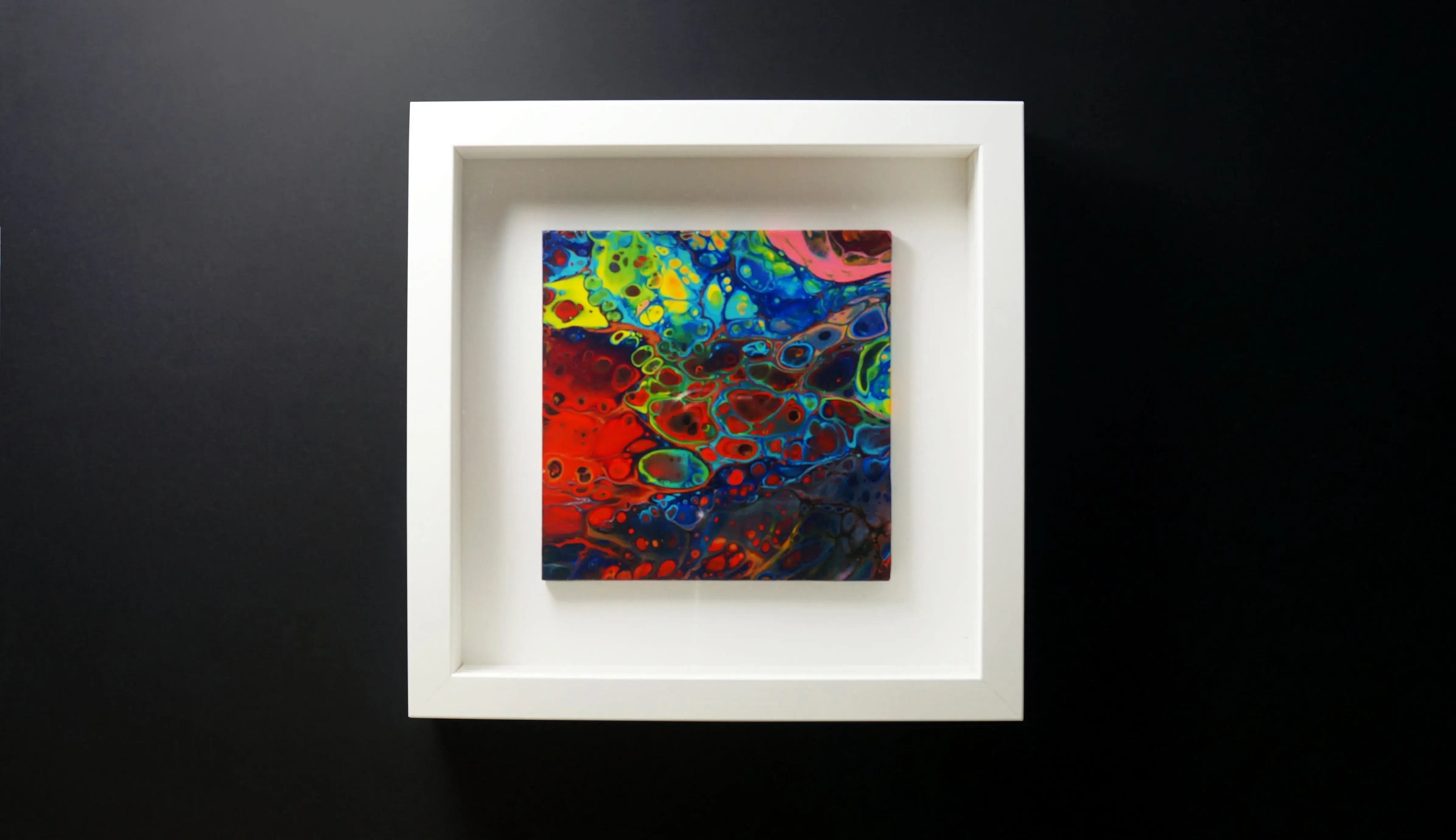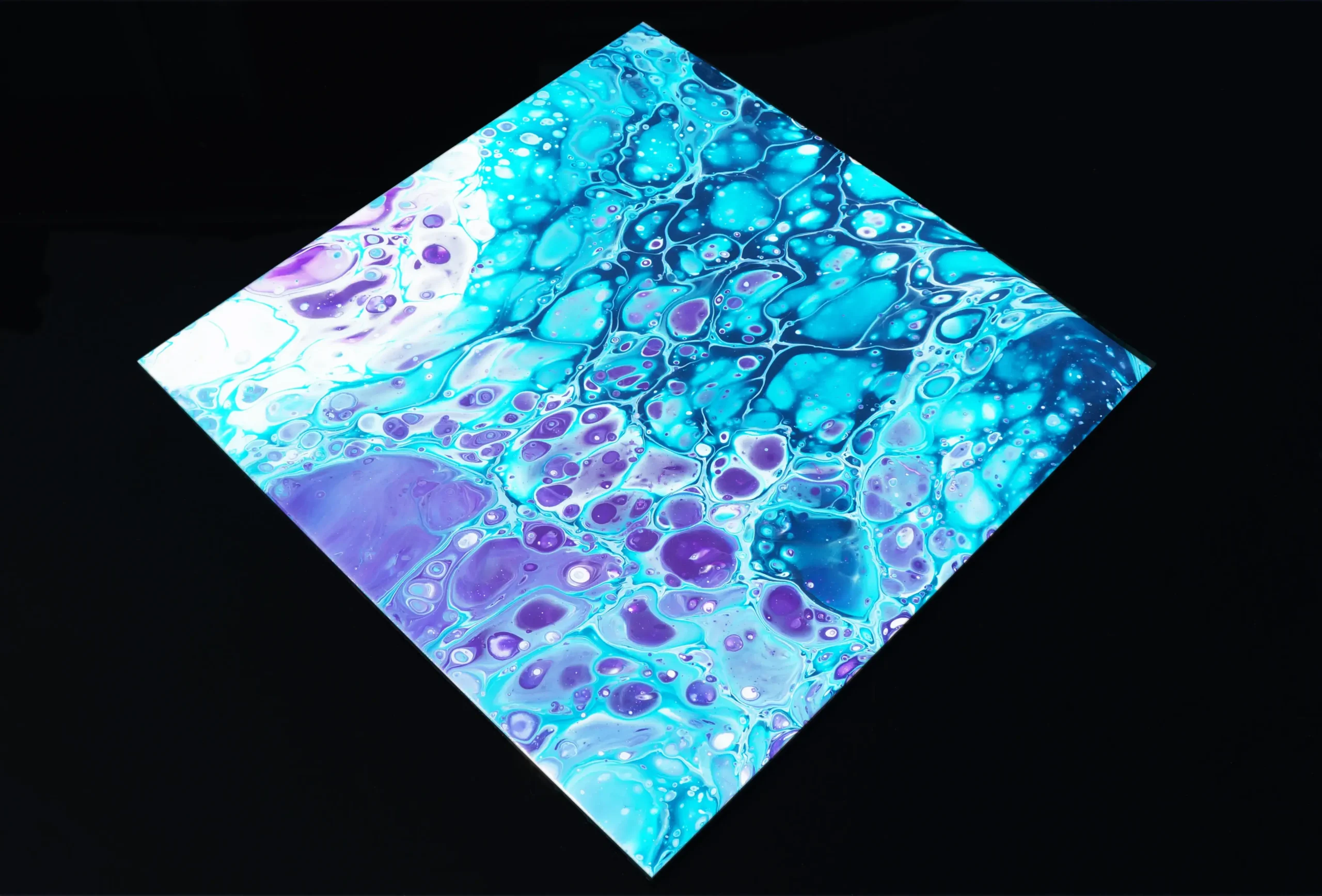 My fluid art embraces freedom, movement, and chance. Unlike my geometric work, which is carefully planned and structured, there is minimal planning beyond variations in method and the choice of colour. I enjoy the randomness inherent in this process, where gravity, flow, and the interaction between colours play a central role. With less control over the final image, the work evolves organically through the combination of my instruction and my assistant’s interpretation, allowing unexpected forms and compositions to emerge through the act of making itself.