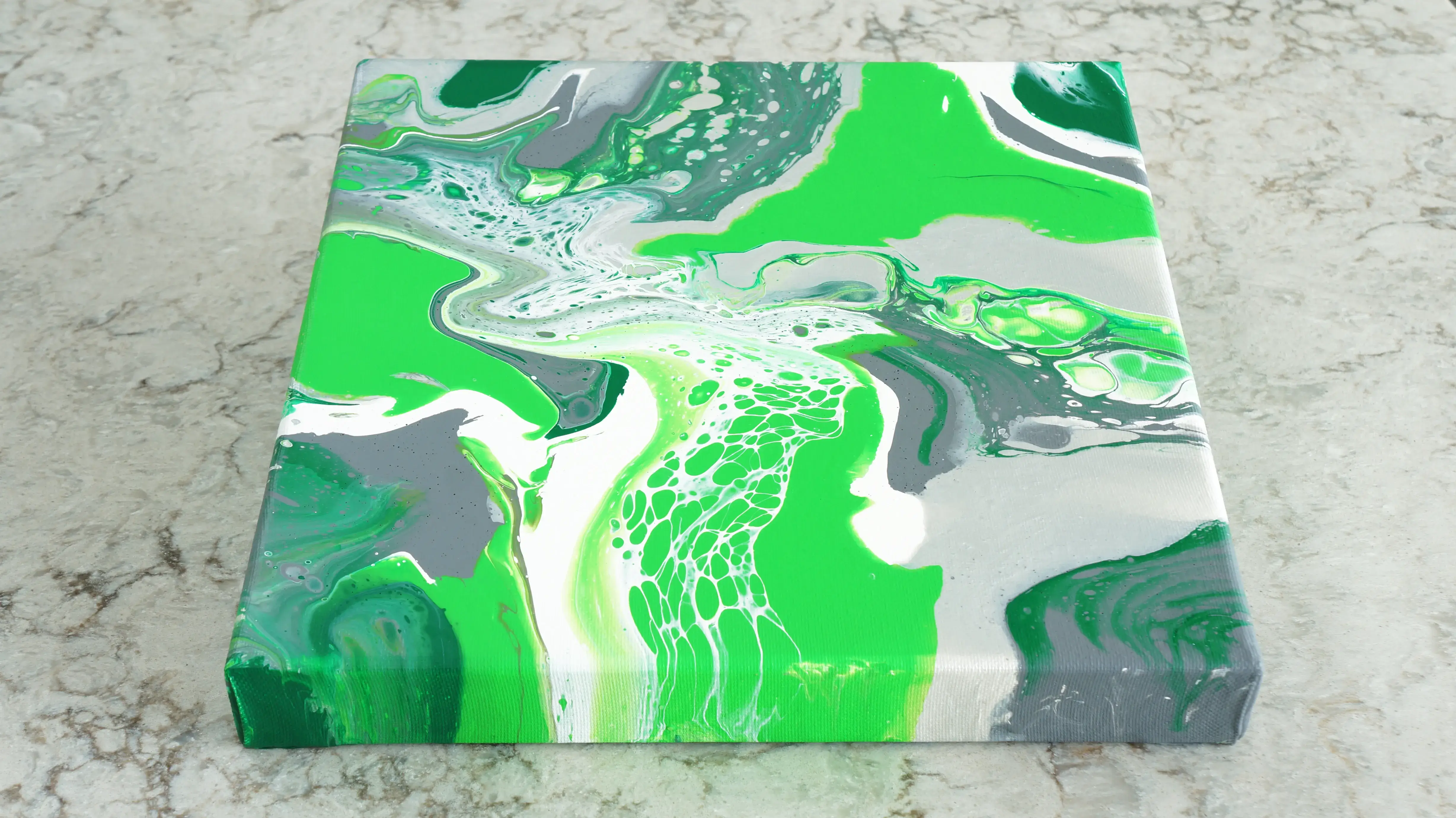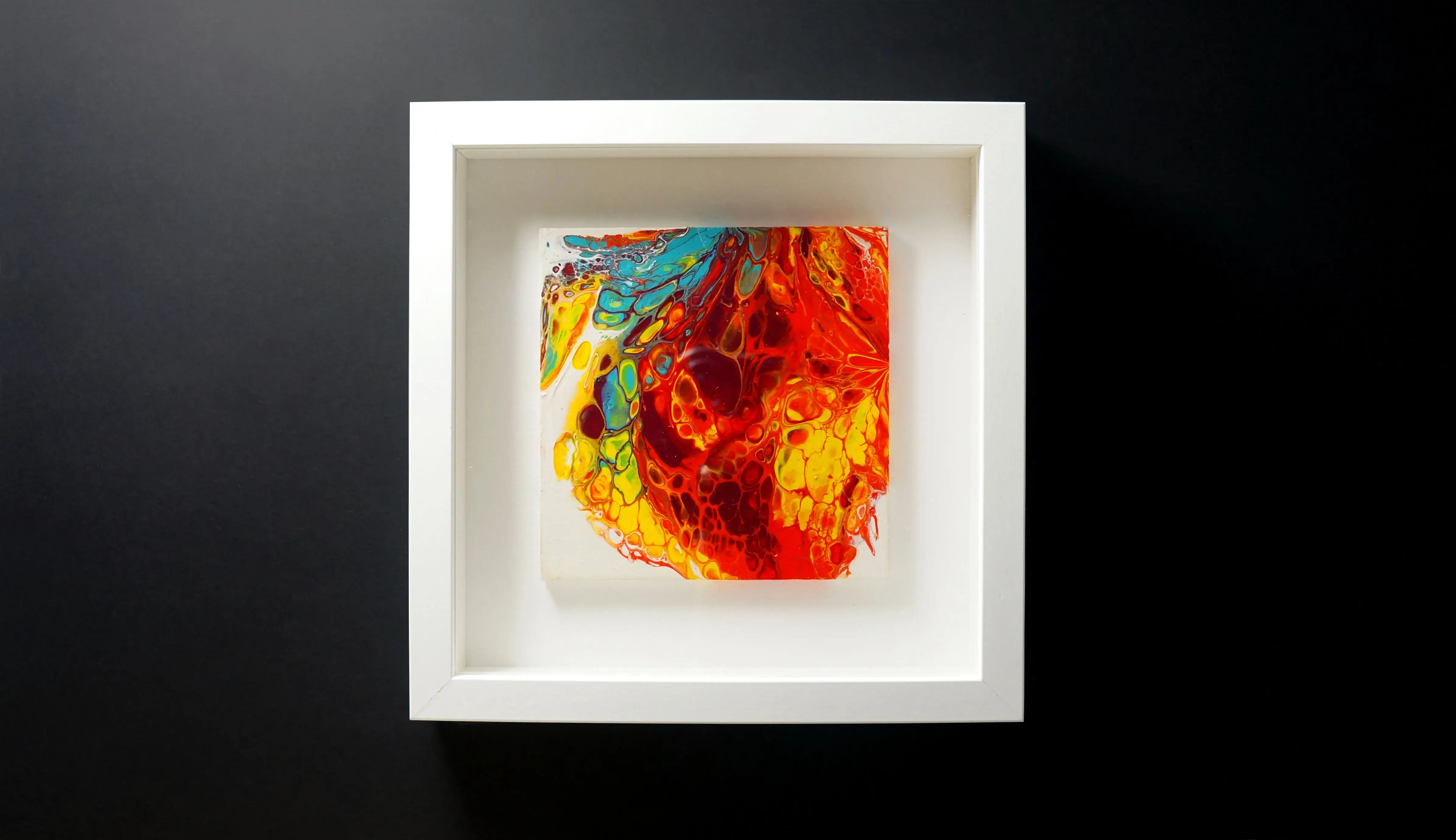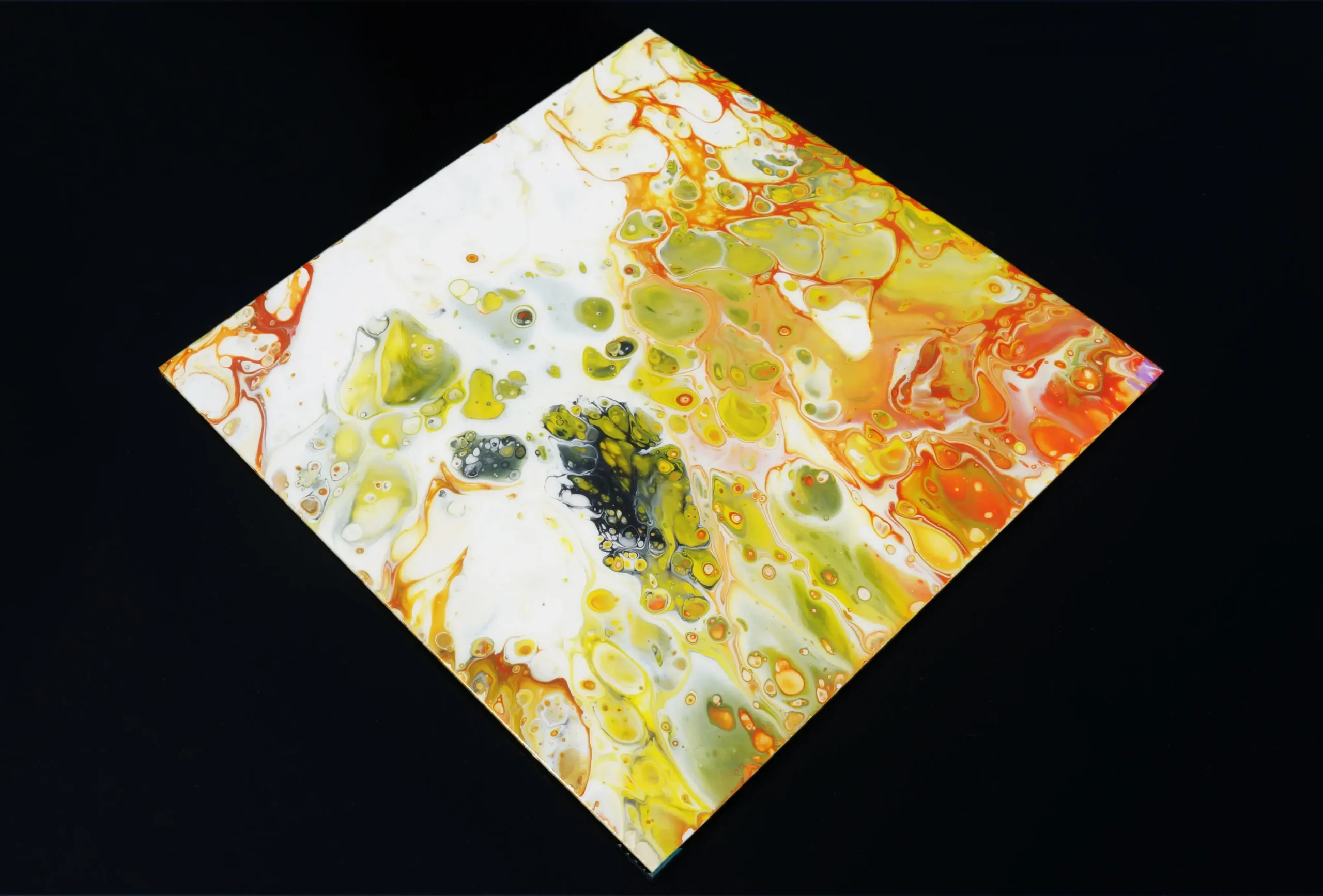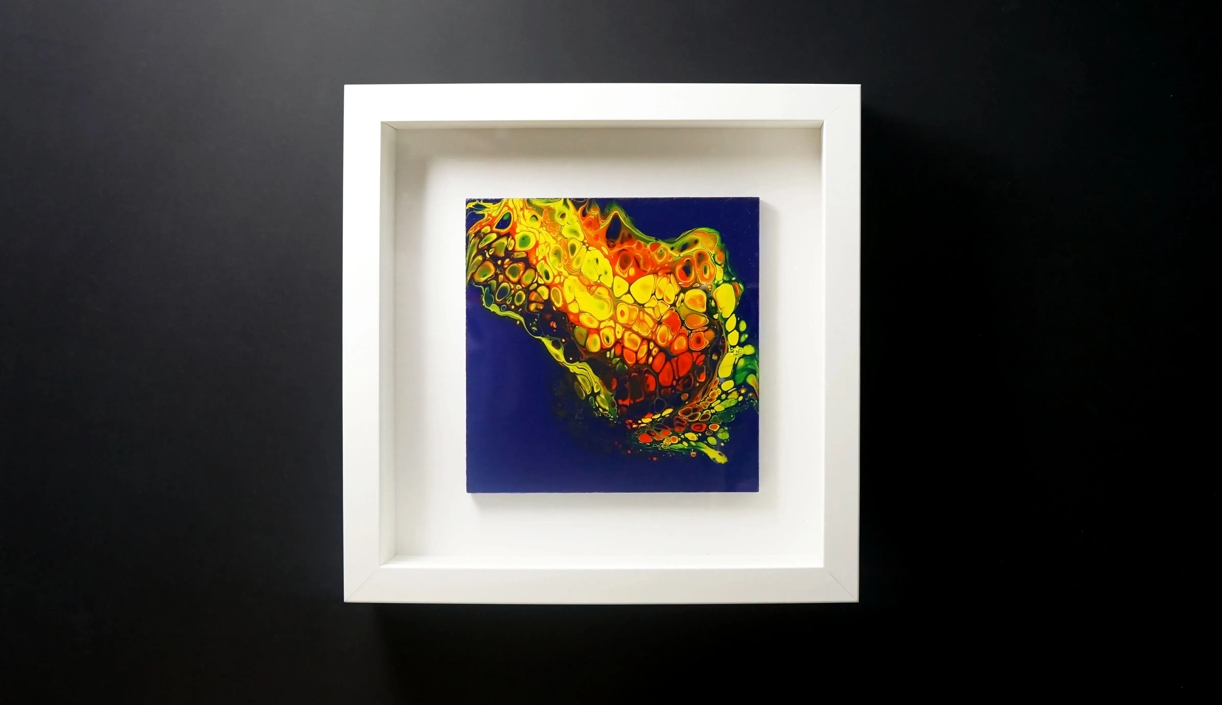 My fluid art embraces freedom, movement, and chance. Unlike my geometric work, which is carefully planned and structured, there is minimal planning beyond variations in method and the choice of colour. I enjoy the randomness inherent in this process, where gravity, flow, and the interaction between colours play a central role. With less control over the final image, the work evolves organically through the combination of my instruction and my assistant’s interpretation, allowing unexpected forms and compositions to emerge through the act of making itself.