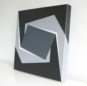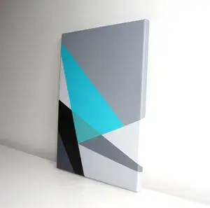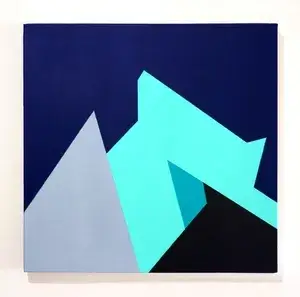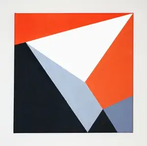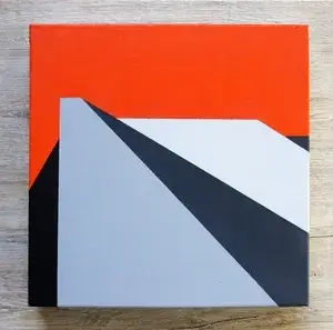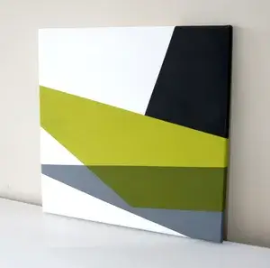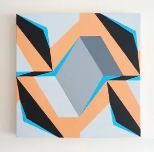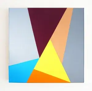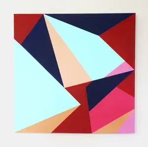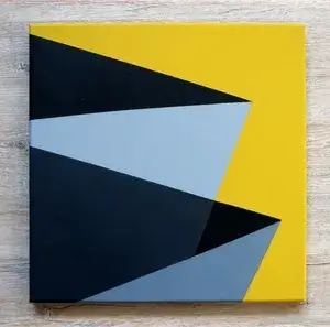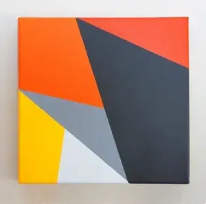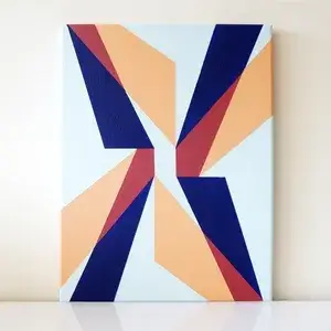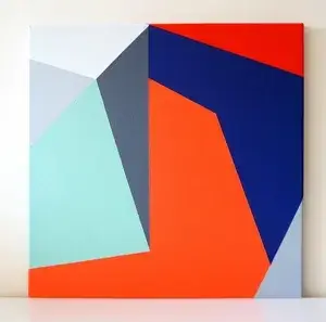 Each piece is first designed digitally, allowing for precision and exploration, before being translated into paint on canvas. The work explores colour, structure, and movement through bold diagonals and carefully arranged forms, with bright, vibrant colours dominating the surface to create a sense of dynamism. I work alongside my PA to realise the paintings, with compositions carefully drawn and masked on the canvas. The tape is meticulously sealed to ensure sharp edges, and each section is painted and allowed to dry fully before moving on to the next area.